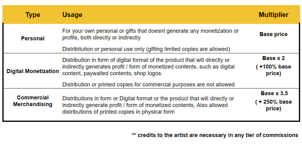 - The price stated are base price for personal use only. Personal use refers using the commissioned piece without any passive or active gain, and does not represent a business brand or branding of any sort.