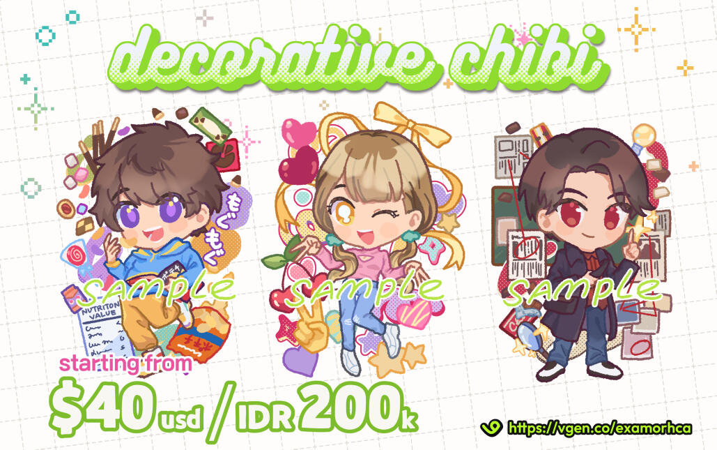 Half Body DecoIllustration of 1 character with 1 simple chibi headshot and 1 simple chibi fullbody, along with decorative background.
