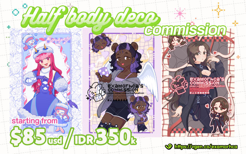 NOTE: the prices stated are base prices, prices might change based on complexity of characther design, additional request, backgrounds etcDiscussion before request are welcomed