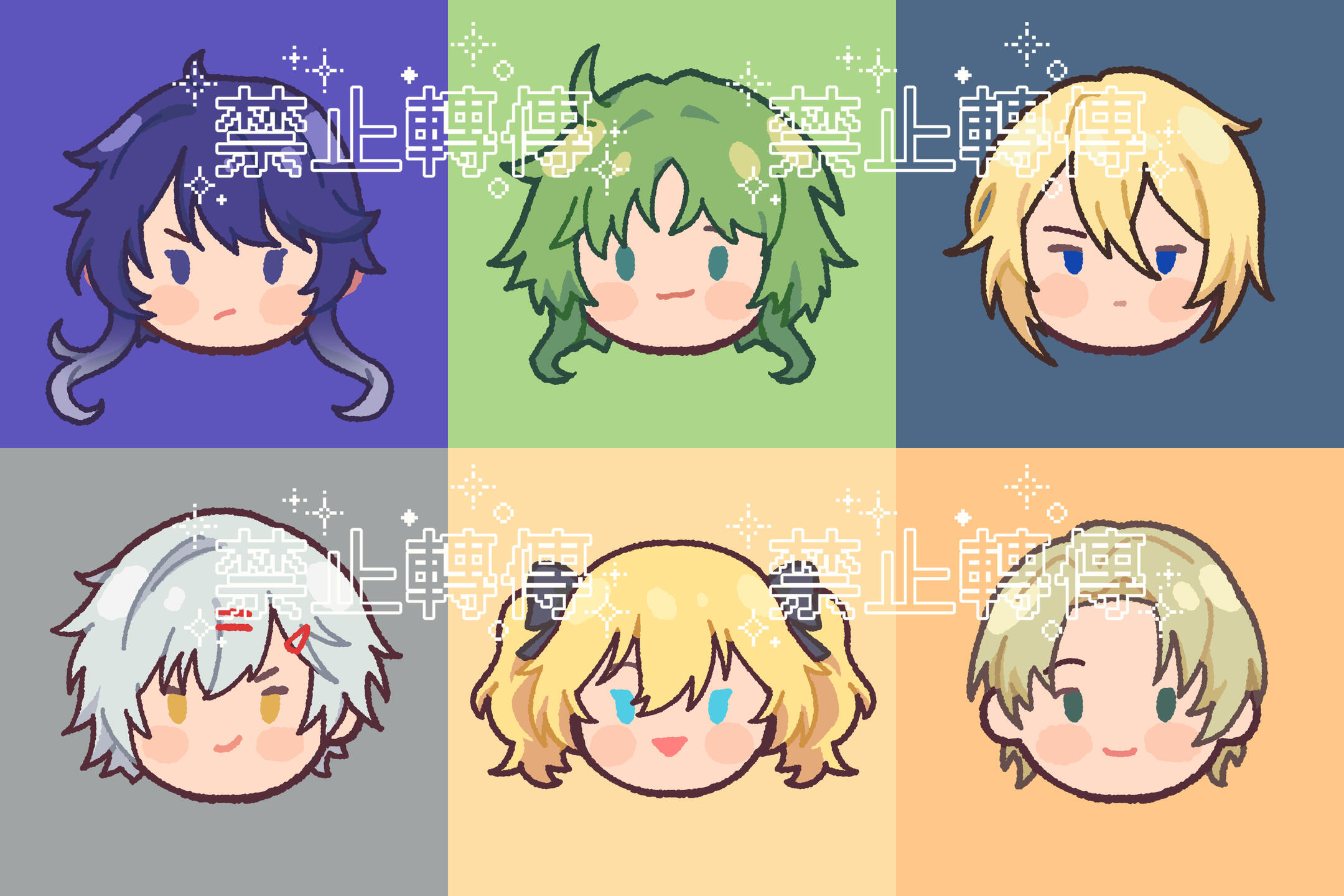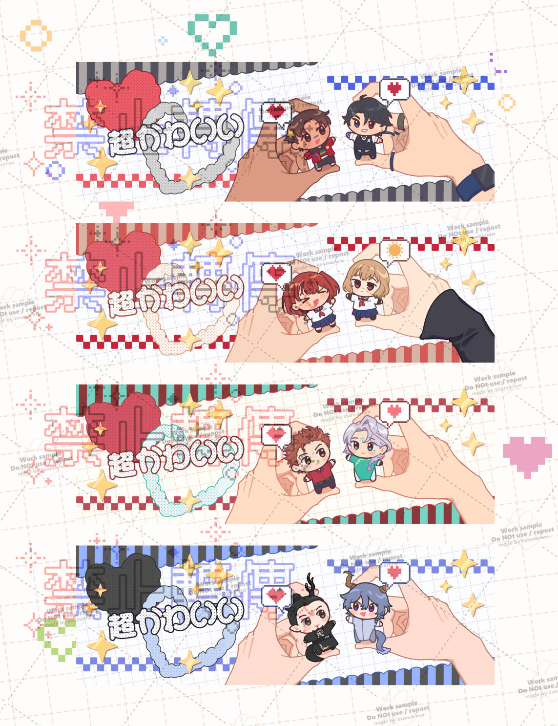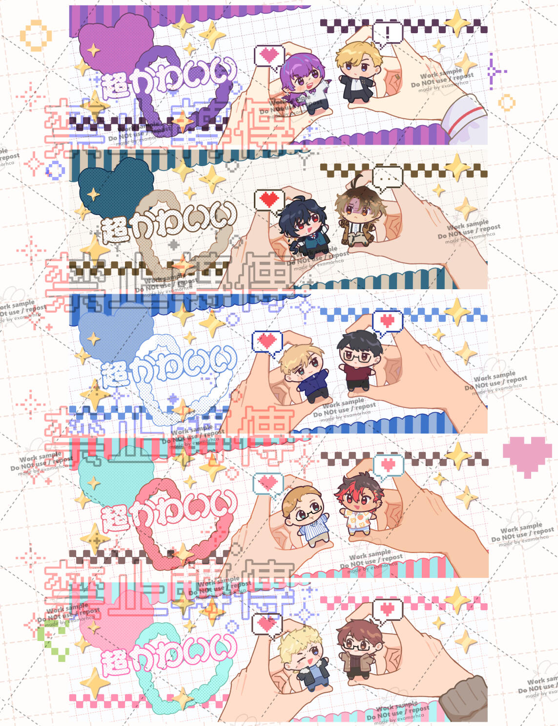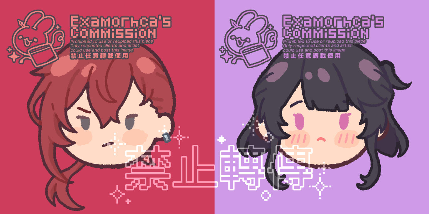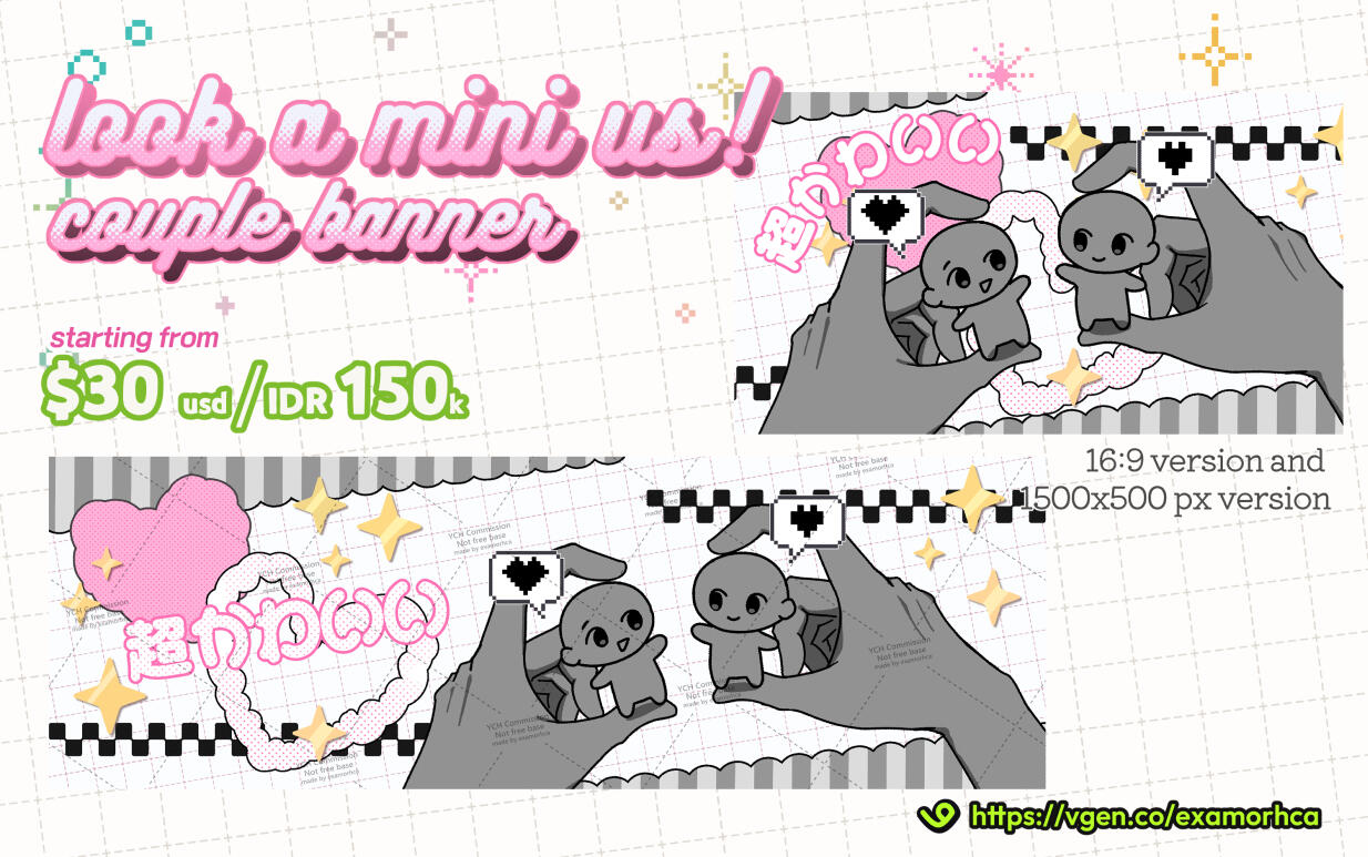 Banner YCH- 2 characters, free customization on background colors, chibi dolls expressions, hands that are holding the 2 chibi dolls